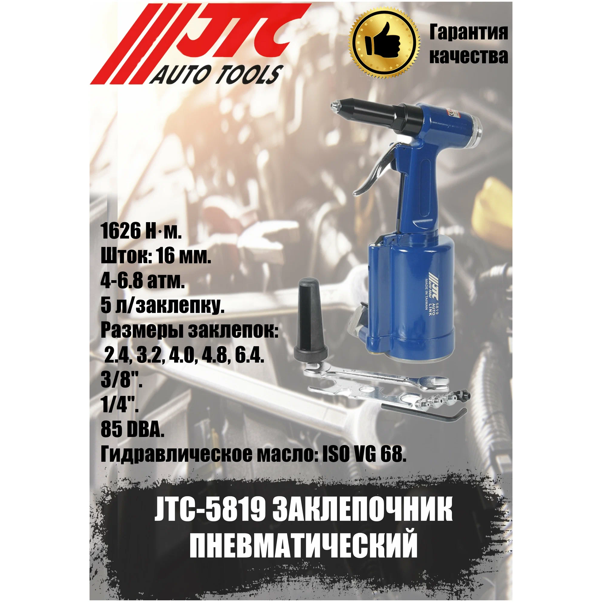 Технические характеристики JTC JTC-5819Тип инструментазаклепочникКласс товарапрофессиональныйТип заклепоквытяжныеТип соединениярапид (EURO)Давление6.8 атмДиаметр воздушного штуцера1/4F дюймРасход воздуха на удар5 л/ударМатериал заклепокалюминий/медьMax диаметр заклепки (алюминий)6.4 ммMax диаметр заклепки (медь)6.4 ммРазмер заклепок2.4; 3.2; 4.0; 4.8; 6.4 ммУпаковкакоробкаГабариты без упаковки170х77х277 ммВес нетто1.65 кг