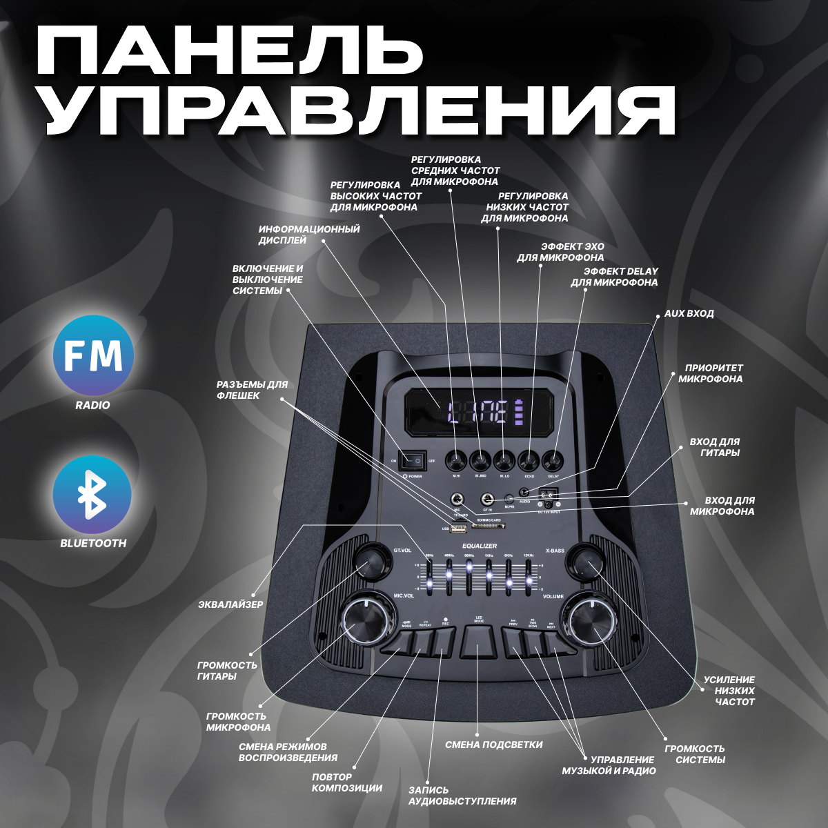 Дисплей, караоке, поддержка microSD, световые эффекты