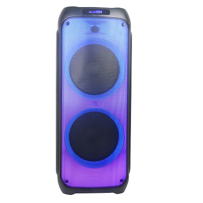 Управлениена верхней панели: переключатель питания (сеть/аккумулятор/выкл), следующая запись/радиостанция, предыдущая запись/радиостанция, воспроизведение/стоп, выбор режима (источника звука), общая громкость больше/меньше, громкость микрофона больше/меньше, эквалайзер, цветомузыка, эхо микрофона больше/меньше, повтор воспроизведения, мега бас