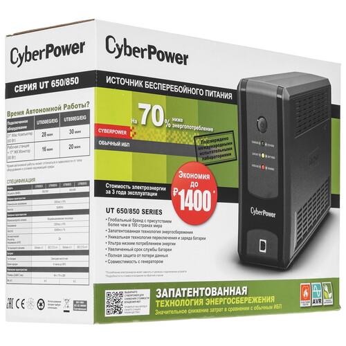 ИБП CyberPower UT650EIG − очень полезный прибор, предназначенный для защиты компьютерного, сетевого оборудования, а также устройств, используемых для хранения данных. Использование линейно-интерактивной топологии позволяет устройству стабилизировать выходную мощность тока. Состояние батареи, сети, неисправность прибора показывает встроенный светодиодный индикатор. Выходная мощность прибора достигает 650 ВА, что соответствует показателю 360 Вт.