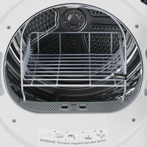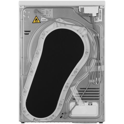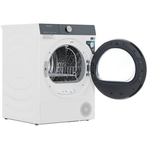 Сушильная машина Hisense DH7S107BW поддерживает удаленное управление через приложение при подключении по Wi-Fi. На передней панели расположены поворотный механизм выбора программ и сенсорный дисплей диагональю 6.86 дюйма. По завершению каждого цикла ворсинки мощным потоком воды удаляются с конденсатора. Это исключает необходимость его обслуживания вручную. Светодиодная подсветка делает комфортной загрузку барабана и извлечение вещей после сушки.