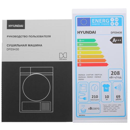Сушильная машина Hyundai DFE9430 серебристого цвета имеет размеры 60x85x62 см. Ее люк диаметром 57 см открывается под углом 170 градусов для быстрой и легкой загрузки вещей. Модель рассчитана на загрузку 10 кг белья. Для экономии пространства можно установить прибор в колонну со стиральной машиной WFE9230, используя монтажный комплект.