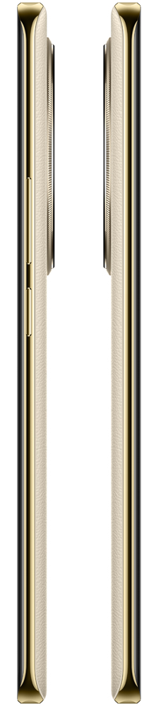 Задняя панель устройства покрыта искусственной кожей. Вокруг дискообразного блока камер и посередине корпуса проходит золотистая металлическая линия.