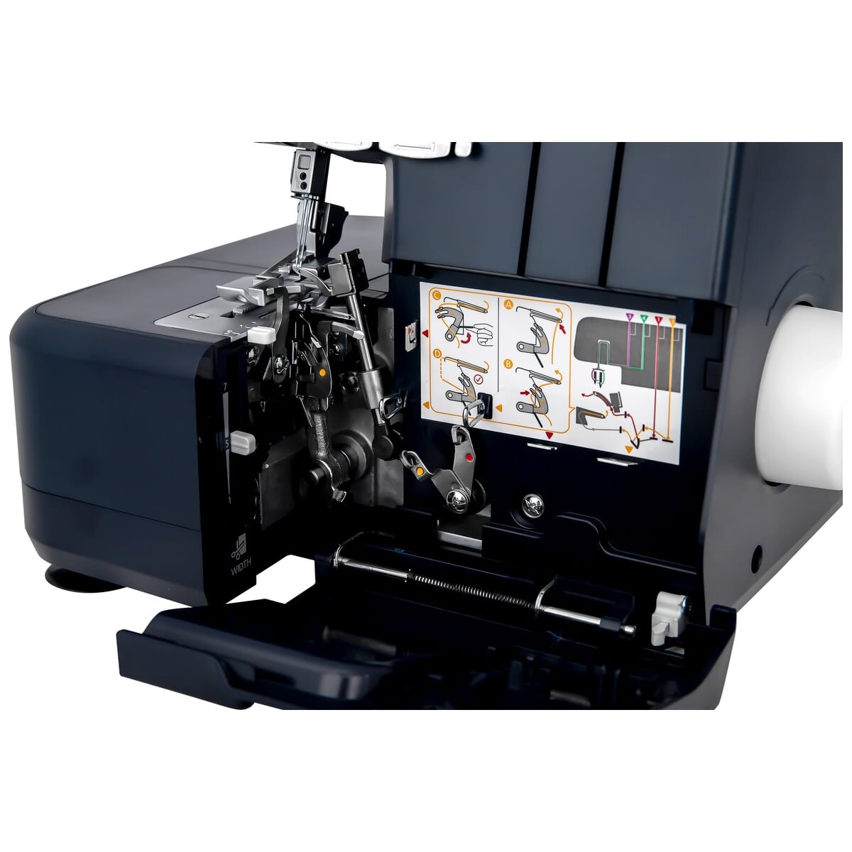 Заправка оверлока нитями упрощена цветными метками на корпусе, исключающими ошибки и неточности. Справочная информация содержится, также в цветной диаграмме на внутренней поверхности передней крышки, что очень удобно и позволяет не иметь постоянно инструкцию под рукой.