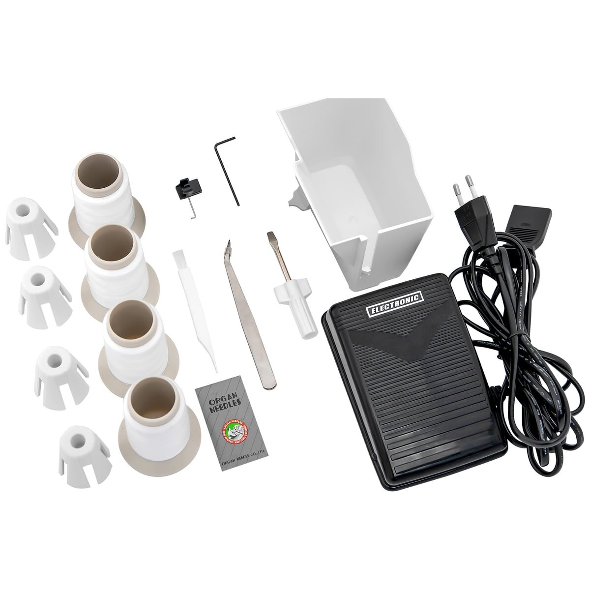 АКСЕССУАРЫ В КОМПЛЕКТЕ - Педаль скорости, мусоросборник, 4 катушкодержателя и 4 катушки нитей, плоская отвертка, набор игл, шестигранная отвертка для замены игл, щеточка, пинцет, насадка для выполнения строчки в 2 нити
