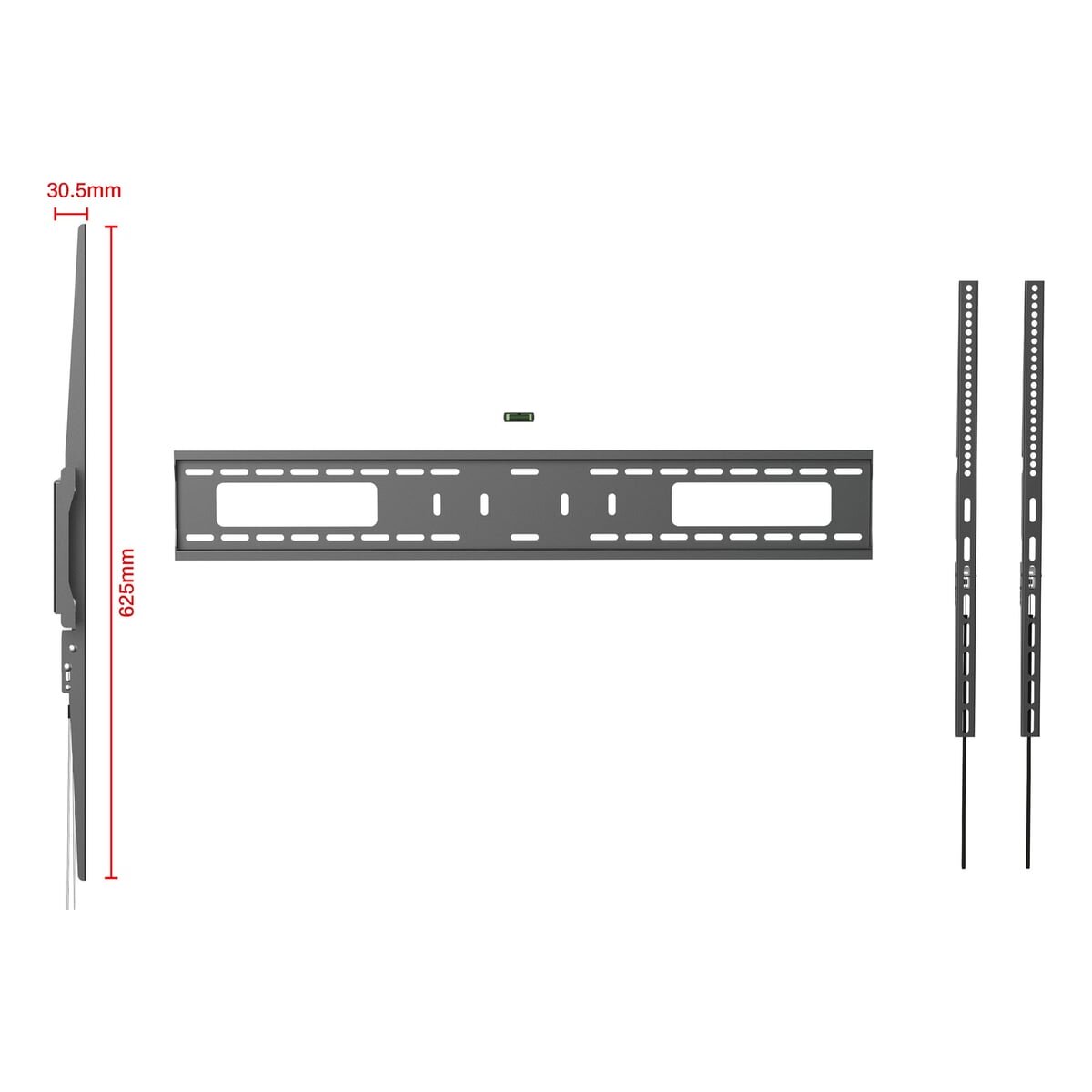 Кронштейн подходит для крепления панелей с множеством вариантов размеров VESA – от самых маленьких (200x200 мм) до самых больших (900x600 мм). В комплектацию кронштейна входит уровень. Он позволяет легко, ровно и быстро закрепить кронштейн на стене. Расстояние от стены составляет 30.5 мм, что придает кронштейну компактный и аккуратный внешний вид, делая его почти незаметным за вашей ТВ-панелью.
