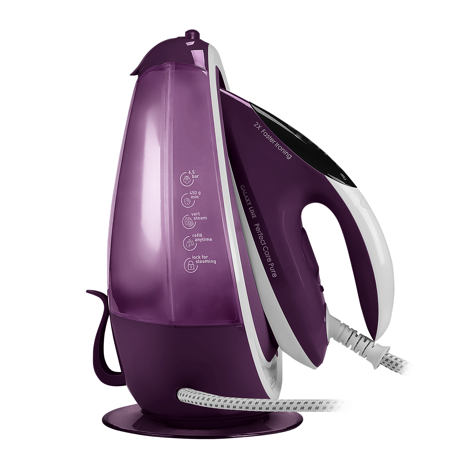 В комплекте: утюг, база, мерный стакан, запасной сменный фильтр для сбора накипи, руководство по эксплуатации