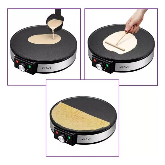 Блинница KITFORT КТ-1678 позволяет быстро испечь блины. Максимальный диаметр блина составляет 30 см. С её помощью также можно приготовить румяные панкейки и оладьи.