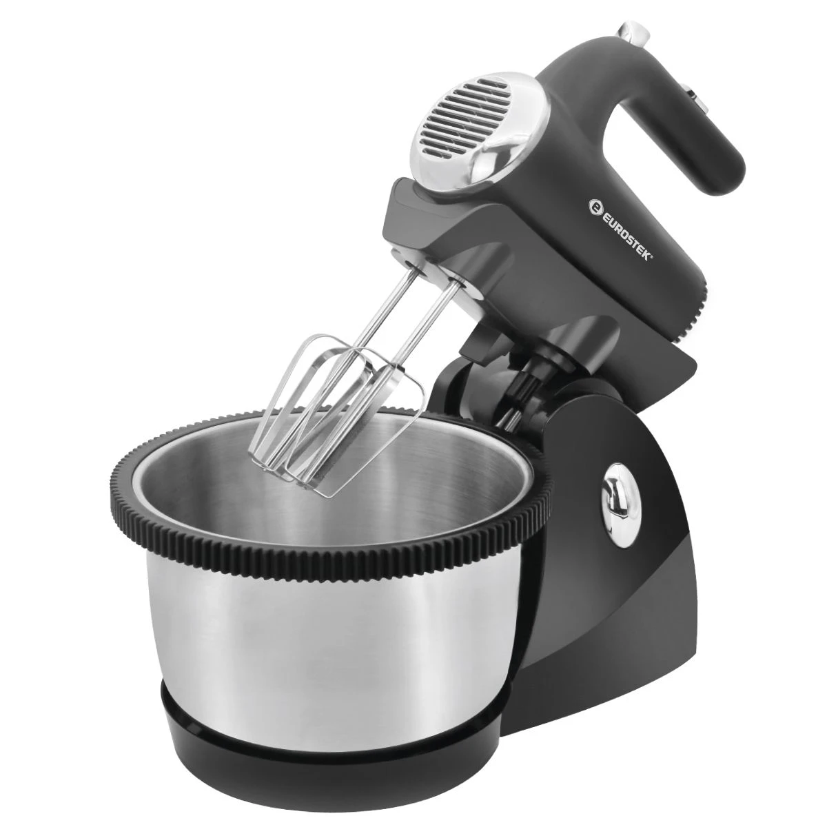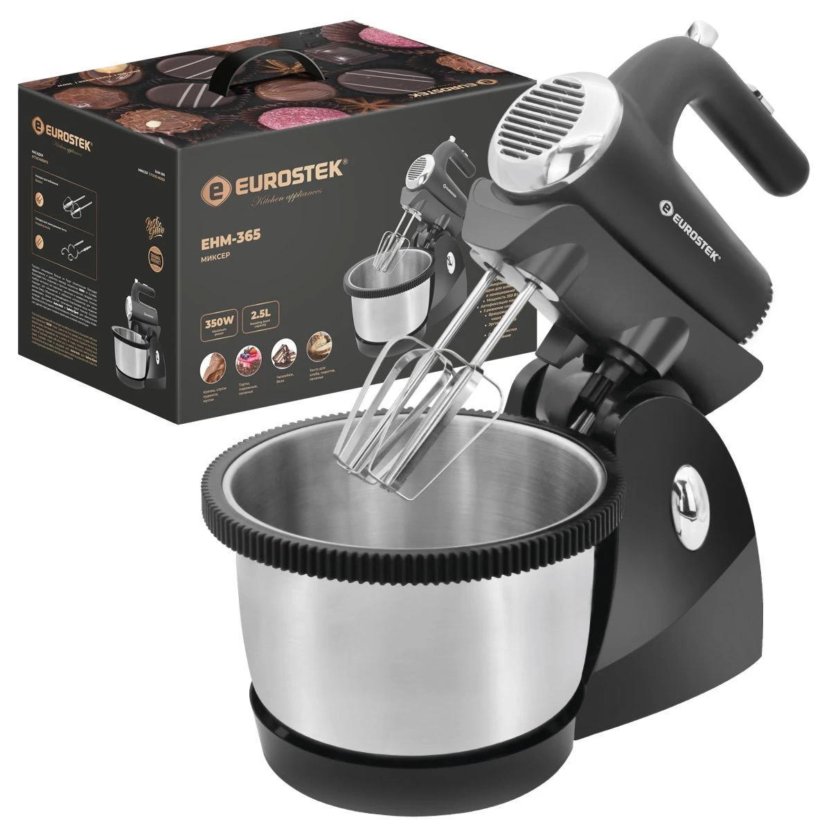 Миксер ручной Eurostek EHM-365. Мощность 350 Вт, 5 скоростей, объем вращающейся пластиковой чаши 2.5 л., насадки для замешивания теста, насадки для взбивания, эргономичный дизайн.