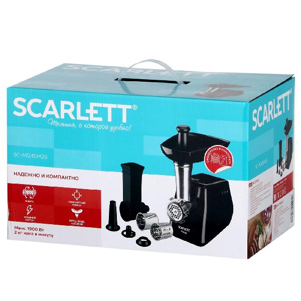Мясорубка Scarlett SC-MG45M26 оптимальна для измельчения продуктов: мяса, рыбы, овощей. Реверс используется для извлечения застрявших кусочков. Для активации режима на корпусе имеется специальный переключатель. Производительность устройства мощностью 1900 Вт равна 2 кг/мин. В комплекте поставляются решетка, терка, кебе, овощерезка, шинковка, насадка для приготовления колбасы. Для предотвращения перегрева мотора модель отключается автоматически. С помощью толкателя обеспечивается безопасная загрузка продуктов.