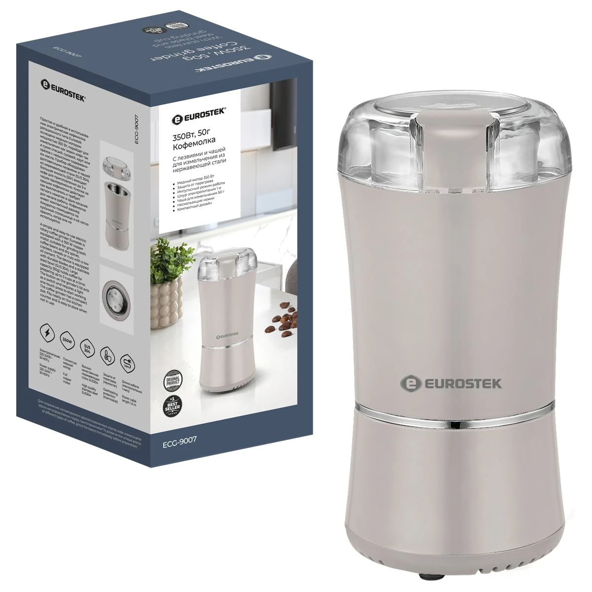 Кофемолка ECG-9007 проста и удобна в использовании. Подойдет для измельчения как зерен кофе так и сухих специй, сухарей, круп. мощность 350 Вт, объем 50 гр.