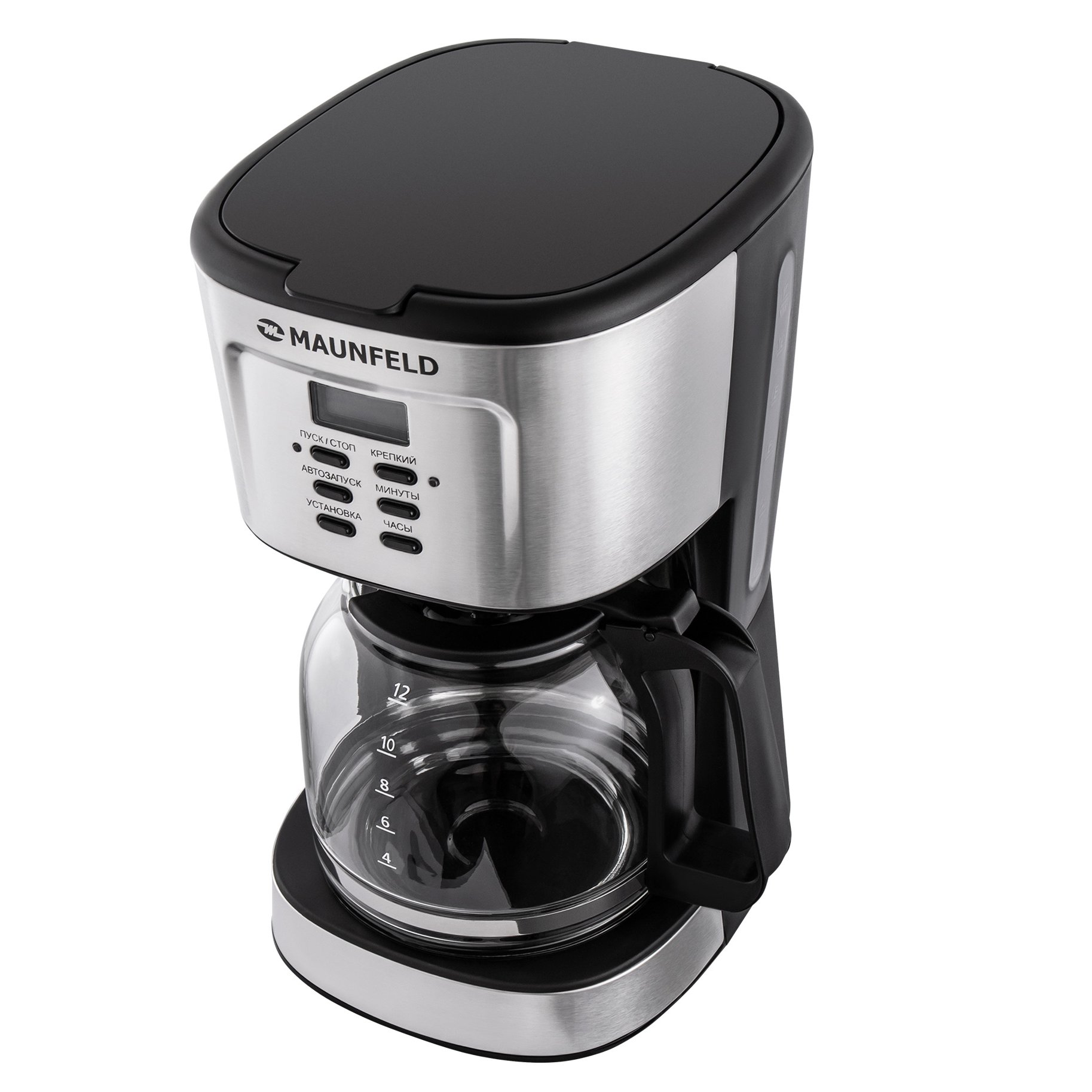 вращающийся фильтродержатель, индикатор уровня воды, индикатор включения, плита автоподогрева, дисплей