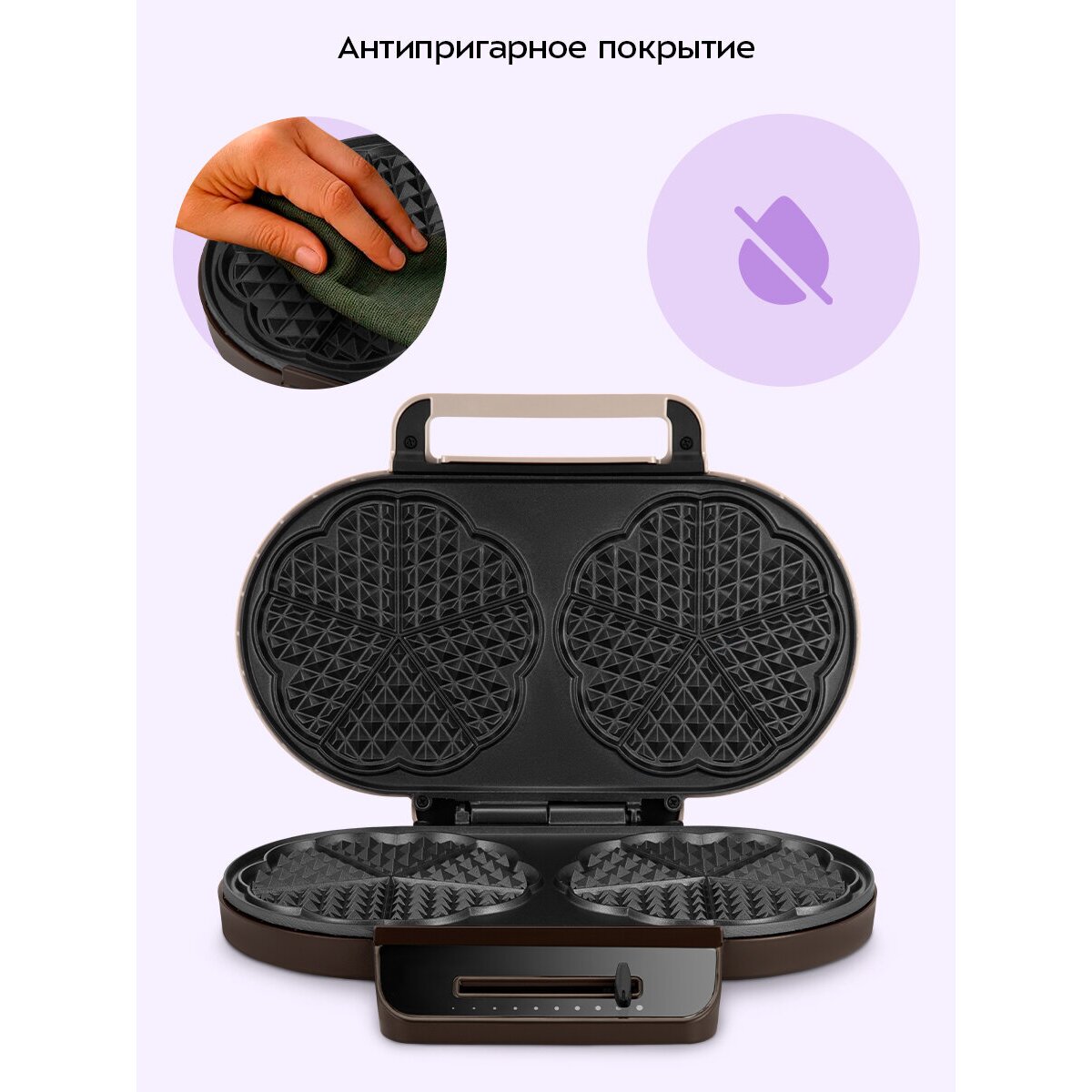 Благодаря антипригарному покрытию тесто не прилипает к панелям, что упрощает процесс приготовления и позволяет делать идеальные вафли без лишних усилий. Также антипригарное покрытие позволяет готовить без масла и облегчает чистку панелей.